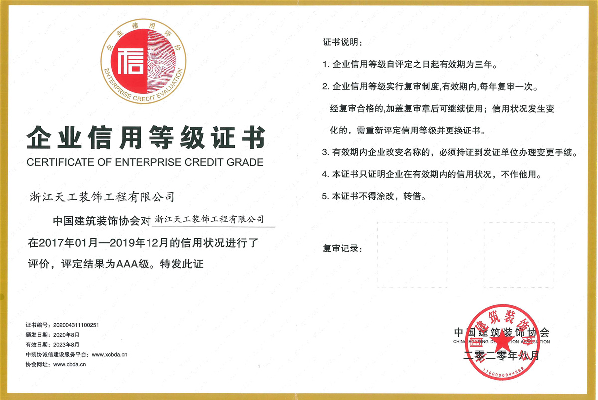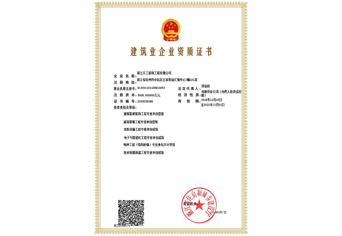 浙江天工裝飾工程有限公司成立于1994年,是一家專注于建筑行業(yè)近三十年,余杭區(qū)內規(guī)模最大、最專業(yè)的現代化專業(yè)承包企業(yè),連續(xù)十二年榮獲“余杭區(qū)建筑業(yè)十強企業(yè)”稱號。公司現任余杭區(qū)建筑裝飾行業(yè)協會會長單位、杭州市建筑裝飾行業(yè)協會副會長單位、浙江省建筑裝飾行業(yè)協會副會長單位、中國建筑裝飾協會理事單位。公司具備建筑裝修裝飾工程專業(yè)承包壹級、建筑幕墻工程專業(yè)承包壹級、建筑裝飾工程設計專項甲級、建筑幕墻工程設計專項甲級、展覽陳列工程設計施工一體化貳級、電子與智能化工程專業(yè)承包貳級、消防設施工程專業(yè)承包貳級、防水防腐保溫工程專業(yè)承包貳級,集建筑工程施工總承包、建筑機電安裝、城市及道路照明、鋼結構、結構補強、安防施工等多項資質。主要從事大型公共建筑、星級酒店的室內精裝修、建筑幕墻及建筑智能化工程的設計與施工。 天工裝飾始終把建筑裝飾當作一項 “美的事業(yè)”,在施工中嚴把質量關,不斷規(guī)范和提升工程技術標準。近年來,公司承建的浙商開元名都國際酒店I標段裝飾工程、杭州藝尚雷迪森廣場酒店裝修工程、余杭區(qū)時代廣場5號樓(市民之家)室內裝飾工程、永安之星室內裝飾工程、青山湖科技城創(chuàng)業(yè)廣場裝修工程、杭州未來科技城醫(yī)院室內裝飾工程、杭州師范大學附屬實驗學校裝修工程、杭州老板電器股份有限公司辦公樓裝飾工程、深川控股集團綜合樓幕墻工程、浙江省科技信息研究院幕墻工程、北航杭州創(chuàng)新研究院(余杭)內裝及智能化提升改造項目(研究生院)工程、臨平新城人才服務中心設計釆購施工(EPC)工程總承包項目、浙江大學先進電氣裝備創(chuàng)新中心室內外裝飾及改造項目設計采購施工(EPC)工程總承包項目等,先后獲得“中國建筑工程裝飾獎”、“全國建筑裝飾科技創(chuàng)新獎”、浙江省建設工程“錢江杯”優(yōu)質工程獎、杭州市建設工程“西湖杯”優(yōu)質工程獎、嘉興市建設工程“南湖杯”優(yōu)質工程獎、“浙江省優(yōu)秀建筑裝飾工程獎”、“浙江省優(yōu)質安裝質量獎”等榮譽。 天工裝飾恪守“誠實守信、文明經營”,近年來公司得到了客戶的信賴也獲得了業(yè)界的好評,先后被評為“國家級守合同重信用單位”、“全國建筑裝飾行業(yè)AAA級信用企業(yè)”、“全國百家科技創(chuàng)新型企業(yè)”、“浙江省AAA級守合同重信用單位”、“人民銀行信用等級AAA級企業(yè)”、“浙江省信用管理示范企業(yè)”、“浙江省誠信企業(yè)”、“浙江省建筑裝飾行業(yè)強優(yōu)企業(yè)”、“杭州市建筑業(yè)優(yōu)秀企業(yè)”、“余杭區(qū)建筑業(yè)十強企業(yè)”、 “余杭區(qū)人民政府質量獎”等榮譽。